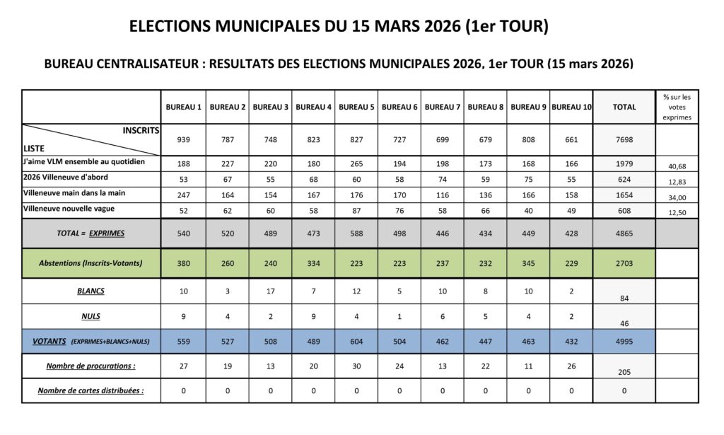 ► Retrouvez ci-dessous les résultats du premier tour des élections municipales 2026 pour la Commune de Villeneuve-lès-Maguelone :