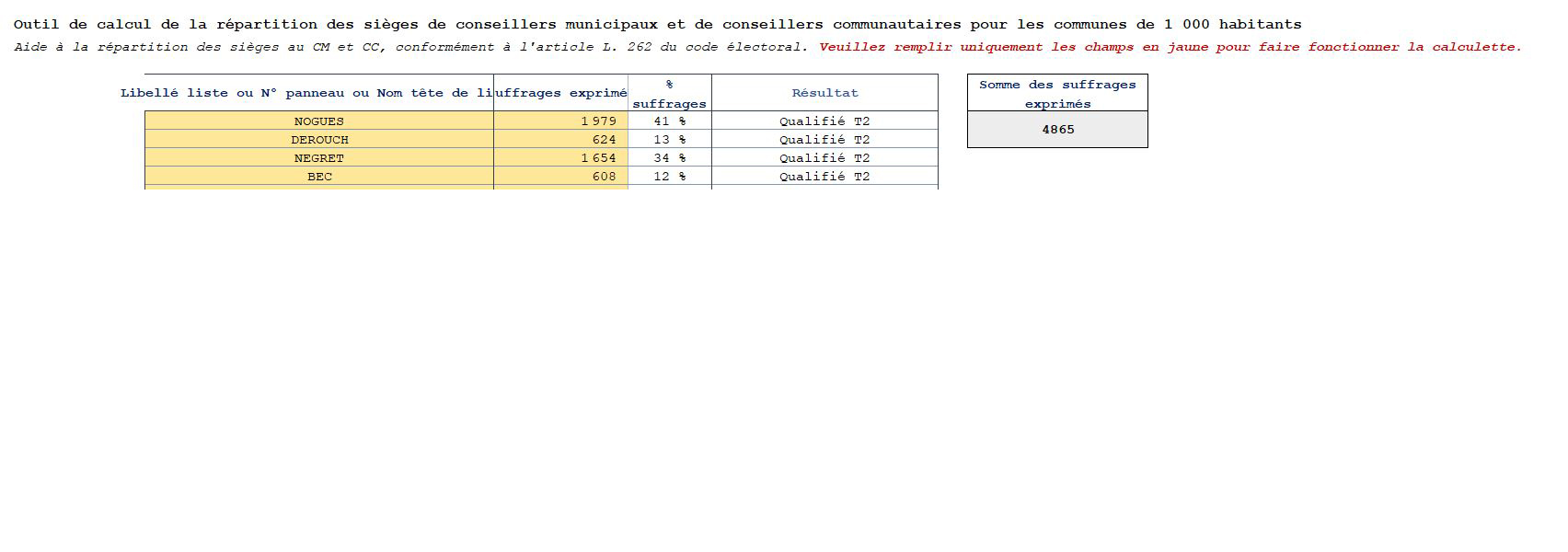 ► Retrouvez ci-dessous l’outil de calcul de la Préfecture déterminant les qualifiés au 2nd tour des élections municipales 2026 pour la Commune de Villeneuve-lès-Maguelone :